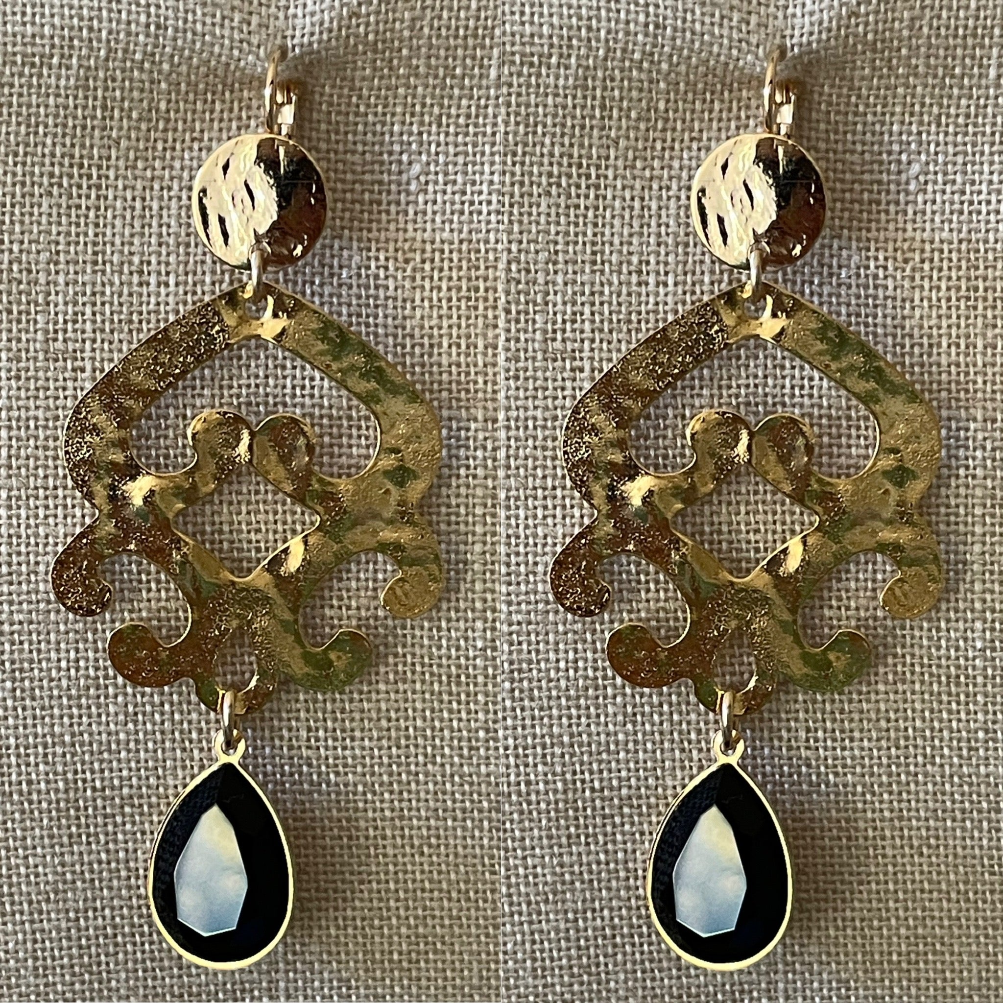 Boucles d'oreilles dorées montées sur dormeuses en laiton. Elles sont composées de cristaux Swarovski et d'un pendentif ethnique couleur or. Les anneaux de jonction sont en or plaqué. Ces boucles très chic sont idéales pour égayer vos tenues pour un mariage, une soirée ou un cocktail.